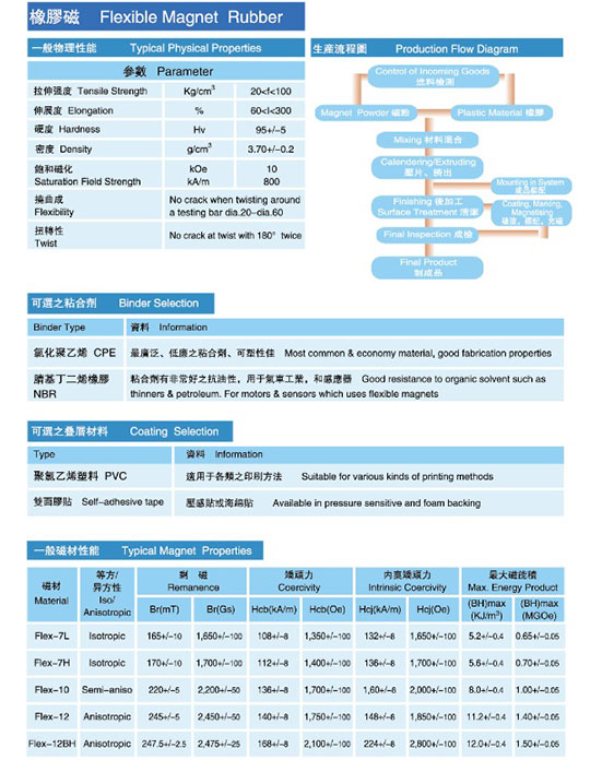 膠磁是由磁粉和橡膠材料複合制成。橡膠磁鐵分成兩種不同材料:等方性橡膠磁鐵及異方性橡膠磁鐵.其差異在於異方性橡膠磁鐵可以以雙面充磁而等方性橡膠磁鐵大部份通常以單價多極充磁。膠磁表面可以貼雙面膠、白色或彩色PVC、印刷等處理。等方性橡膠磁鐵具有柔軟性,彈性及可扭曲性的材質,可生產成條狀,卷狀及可方便地切割成各種複雜形狀。